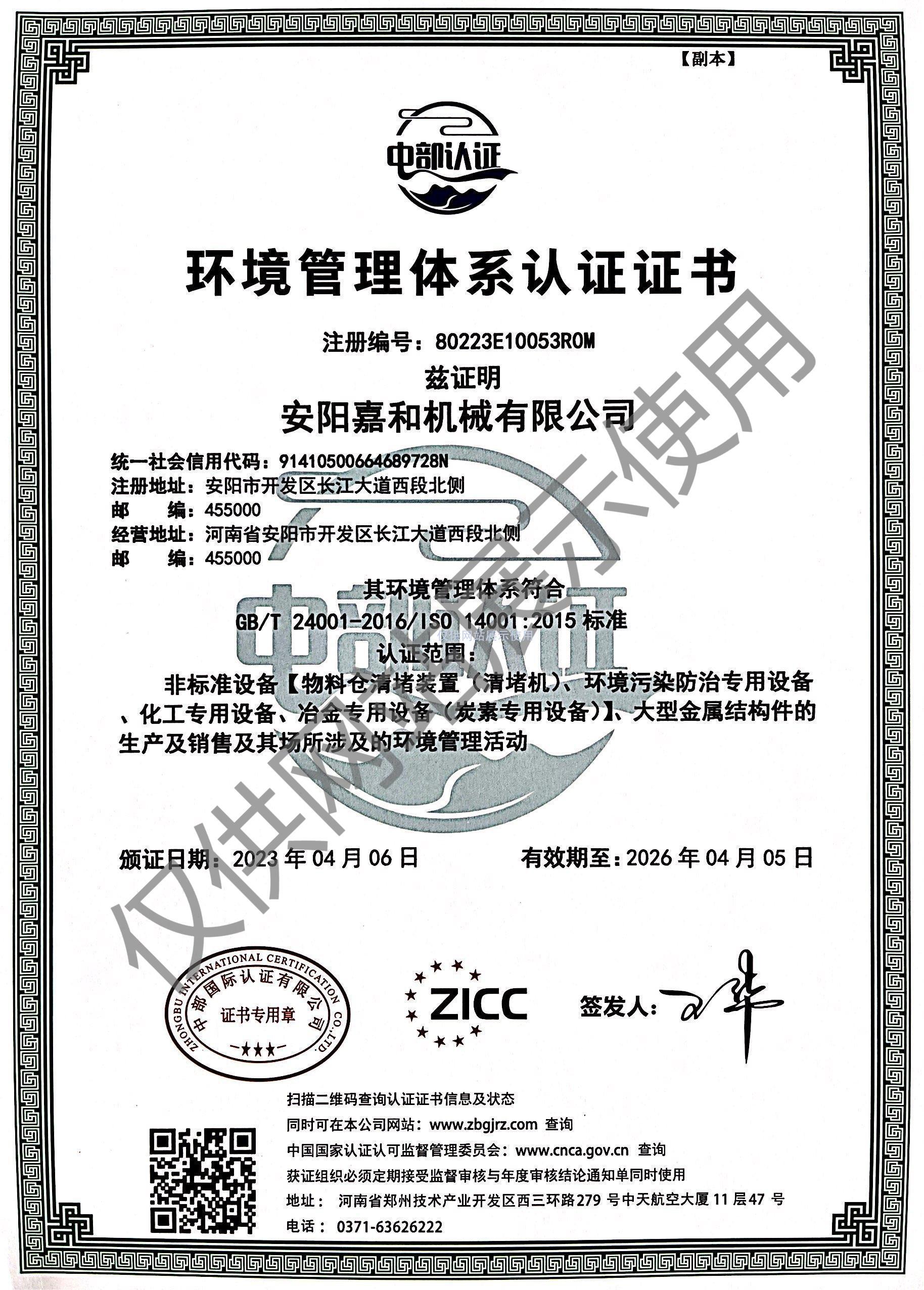 環(huán)境管理體系認證證書