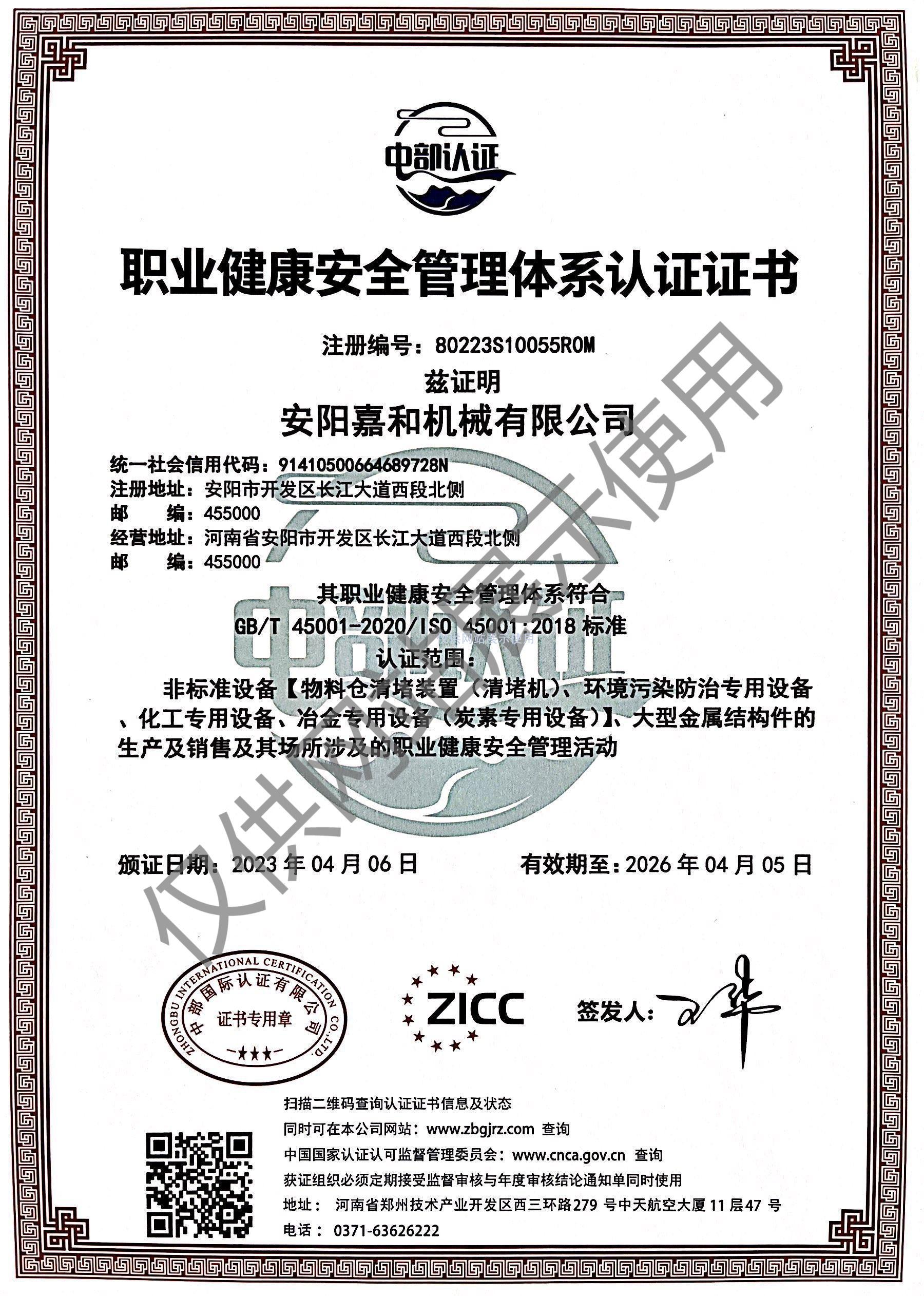 職業(yè)健康安全管理體系認(rèn)證證書